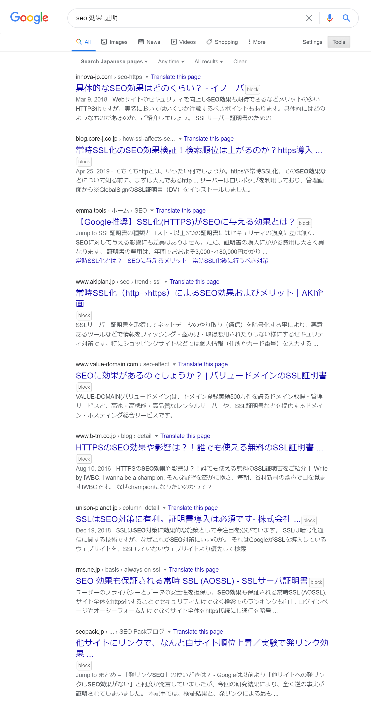seo 効果 証明 とググったら次のような結果に。これは面白い。 SSL に対応しろとのページがほとんど。具体的に効果のあるテクニックがそれ以外にないということかもしれない。